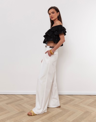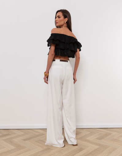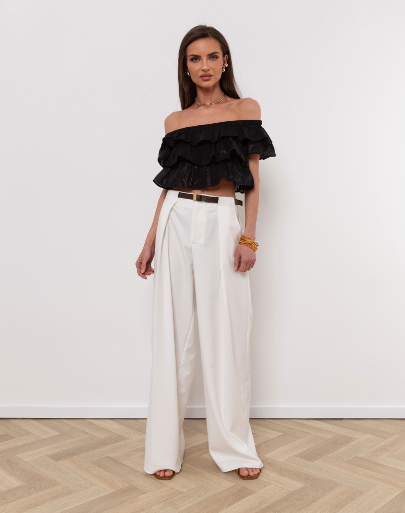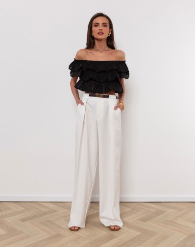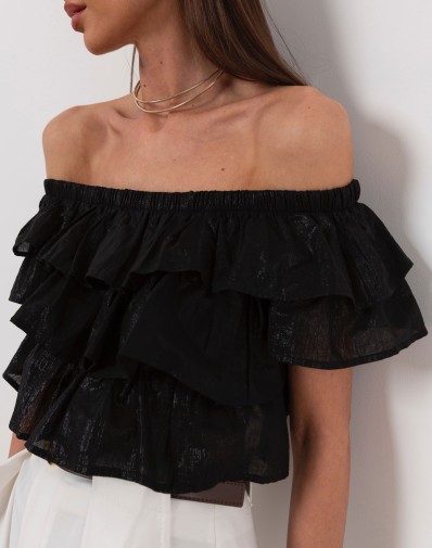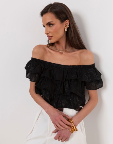 Bawełniana bluzka z falbankami.Krój hiszpanki, dół bluzki również zakończony gumką .Bluzka wykonana z trzech falban.Materiał 100% bawełna.Delikatnie się mieni.