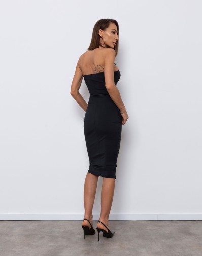 Obcisła sukienka bez ramiączek z usztywnianymi miseczkami to połączenie elegancji i zmysłowości. Wykonana z przemiłego, elastycznego materiału, pięknie dopasowuje się do sylwetki i podkreśla kobiece kształty. Z tyłu wszyta guma gwarantuje wygodę i idealne dopasowanie. Dodatkowa róża z paskiem do zawiązania na szyi dodaje całości wyjątkowego, romantycznego charakteru. Idealna na wieczorne wyjścia, przyjęcia i wyjątkowe okazje.