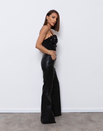 Zmysłowy czarny gorset na cienkich, regulowanych ramiączkach zachwyca bogatymi aplikacjami 3D w formie kwiatów i delikatnymi błyszczącymi kryształkami. Model posiada usztywniane miseczki, które pięknie podkreślają biust i zapewniają doskonałe dopasowanie. Tył wyposażony jest w regulowane zapięcie, co gwarantuje wygodę i idealne ułożenie na sylwetce. Ten efektowny top to perfekcyjny wybór na imprezę, romantyczną kolację czy wieczorne wyjście – dodaje pewności siebie i przyciąga spojrzenia.