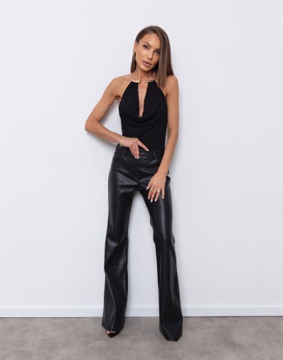 Eleganckie body o wyjątkowym kroju, które przyciąga uwagę głębokim dekoltem i efektownym wykończeniem przy szyi. Model wykonany z delikatnej, koronkowej tkaniny z podszewką, zapewniającą komfort noszenia. Tył pozostaje odkryty, co dodaje całości zmysłowego charakteru. Idealne na wieczorne wyjścia – świetnie komponuje się zarówno ze spódnicą, jak i skórzanymi spodniami.