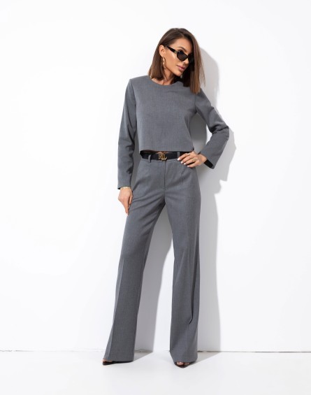 Bluzka o klasycznym kroju z długim rękawem. Zapinana na zamek kryty z tyłu. Zaokrąglony dekolt, w ramionach poduchy.Spodnie z rozszerzaną nogawką. W pasie szlufki. Przód zapinany na klasyczne zapięcie. Z przodu wsuwane kieszenie. Z tyłu patki.