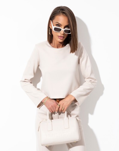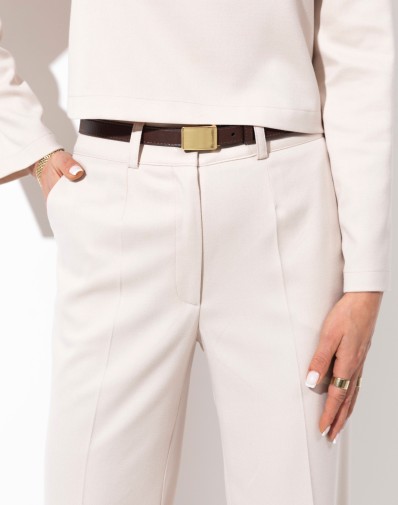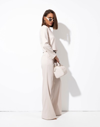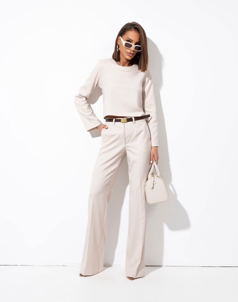 Bluzka o klasycznym kroju z długim rękawem. Zapinana na zamek kryty z tyłu. Zaokrąglony dekolt, w ramionach poduchy.Spodnie z rozszerzaną nogawką. W pasie szlufki. Przód zapinany na klasyczne zapięcie. Z przodu wsuwane kieszenie. Z tyłu patki.