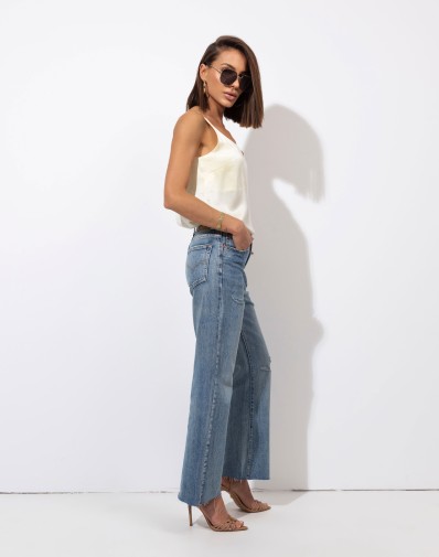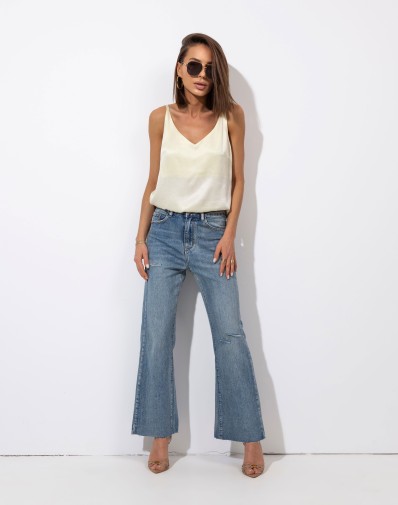 Wiskozowy top na cienkich ramiączkach. Materiał lejący. Idealny przez cały rok pod żakiet lub sweter. Na lato stylowa i wygodna bluzka do szortów lub spódnicy.