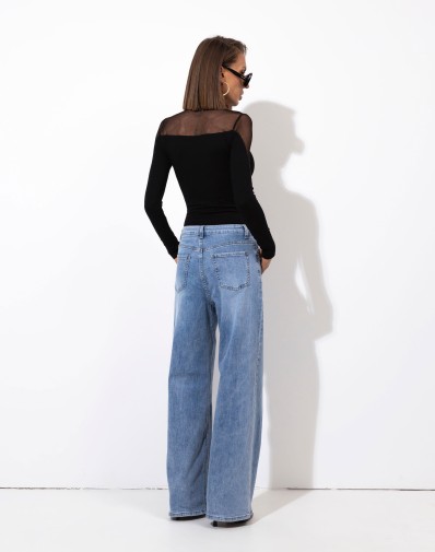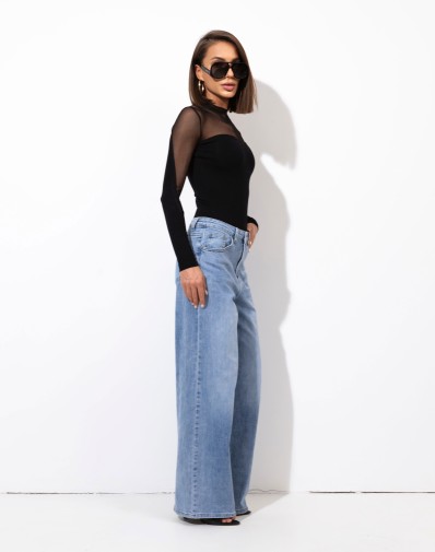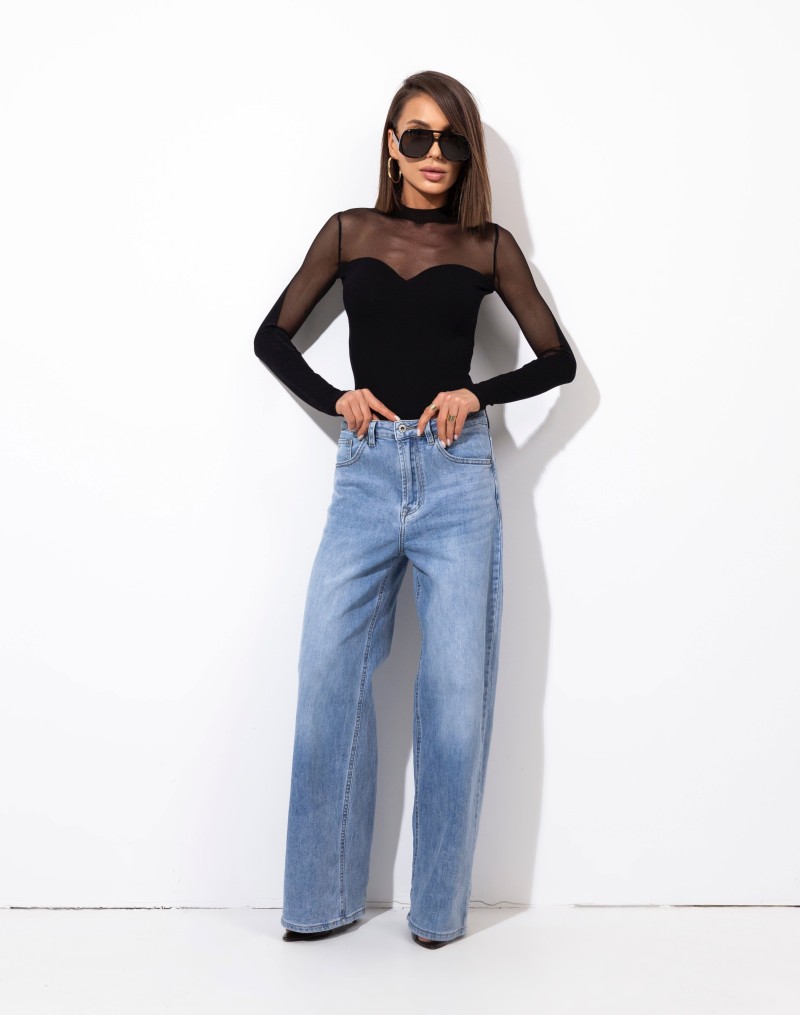 Eleganckie czarne body z transparentnej siateczki w górnej części i na rękawach. Model dopasowany, z efektownym dekoltem w kształcie serca, pięknie podkreślający sylwetkę. Idealne zarówno do jeansów, jak i bardziej eleganckich stylizacji wieczorowych.