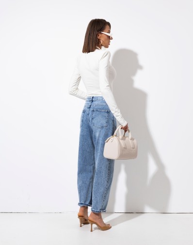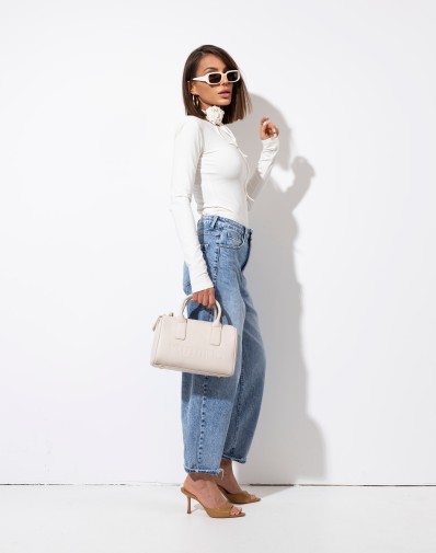 Eleganckie body w śmietankowym odcieniu, uszyte z wyjątkowo przyjemnego w dotyku materiału. Posiada długi rękaw z subtelnymi poduszkami w ramionach, które pięknie podkreślają sylwetkę. Klasyczny, zaokrąglony dekolt dodaje kobiecego uroku, a dołączona materiałowa róża daje możliwość efektownego wiązania na szyi – tworząc oryginalny i zmysłowy akcent stylizacji.