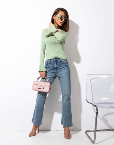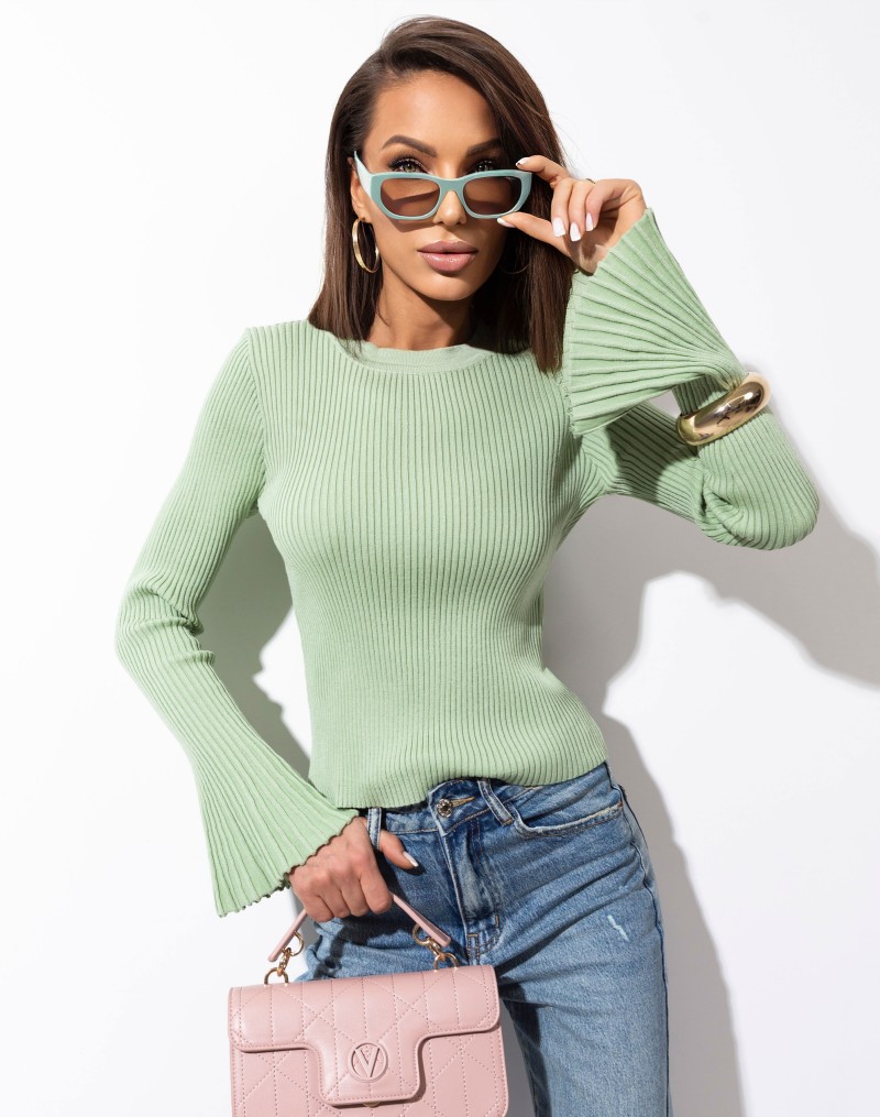 Bluzka Fabia Prążkowana z Szerokimi Rękawami Pistacjowa