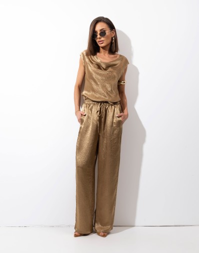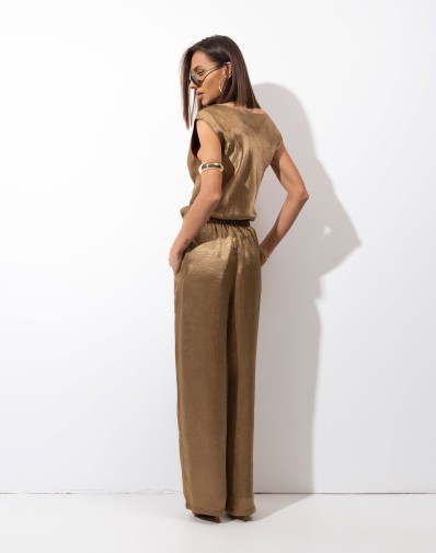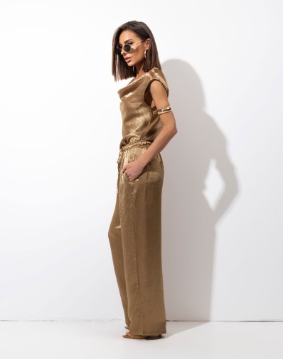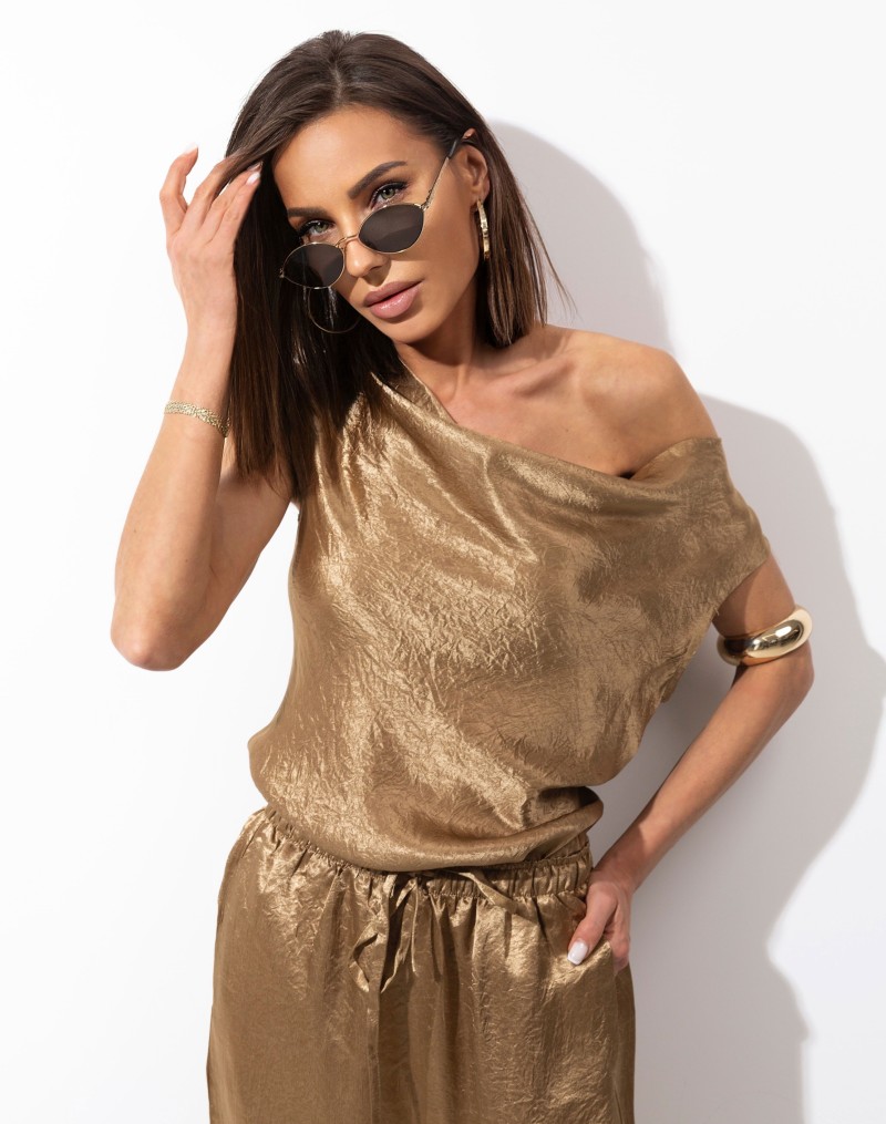 Złota bluzka wykonana z delikatnego, subtelnie połyskującego acetatu, który pięknie układa się na sylwetce. Model bez rękawów, z tyłu dekolt typu łódka, nadaje stylizacji kobiecej lekkości i elegancji. Delikatnie podkreślona talia wysmukla figurę i dodaje całości harmonii. To wyjątkowa propozycja, która doskonale sprawdzi się zarówno w wieczorowych, jak i bardziej minimalistycznych stylizacjach.