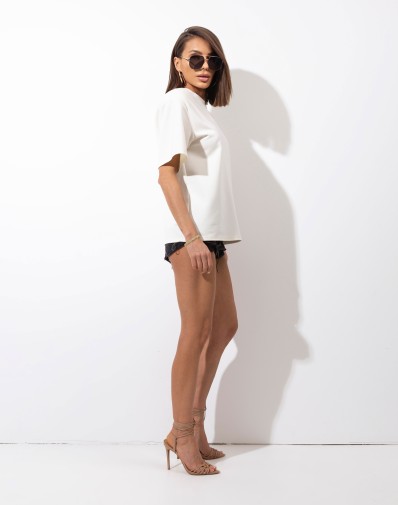 T-shirt o luźnym kroju.Model o zaokrąglonym dekolcie oraz krótkimi rękawami.Efektowne,duże poduchy w ramionach nadające kształt. Idealnie sprawdzi się z luźnymi spodniami czy spódnicą. Wykonana z elastycznej dzianiny.