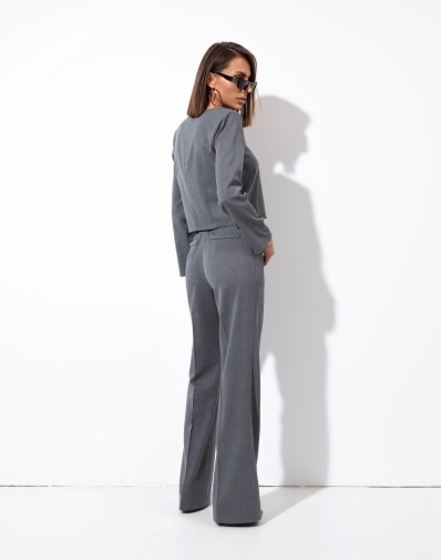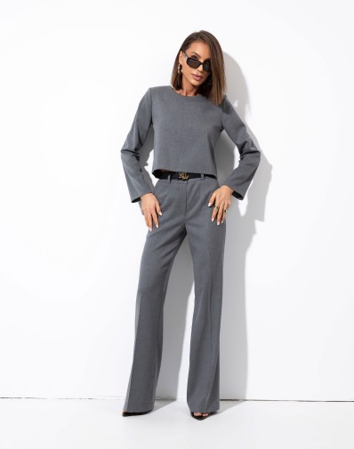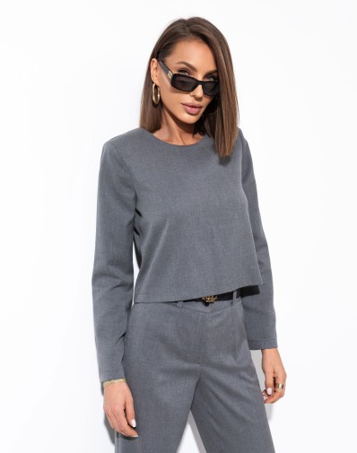 Bluzka o klasycznym kroju z długim rękawem. Zapinana na zamek kryty z tyłu. Zaokrąglony dekolt, w ramionach poduchy.Spodnie z rozszerzaną nogawką. W pasie szlufki. Przód zapinany na klasyczne zapięcie. Z przodu wsuwane kieszenie. Z tyłu patki.
