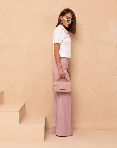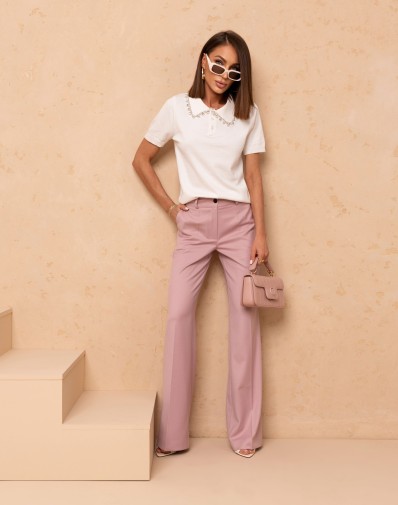 Sweterkowa Bluzka z krótkim rękawem oraz z kołnierzykiem. Zapinana na guziki przy szyi.Klasyczny krój z Eleganckim kołnierzykiem zdobionym drobnymi, srebrnymi cyrkoniami, które nadają całości subtelnego blasku.Krótki rękaw zakończony delikatnym prążkiem.Model idealny jako baza do wielu stylizacji tych elegancki jak i tych codziennych .