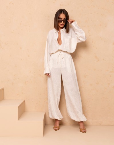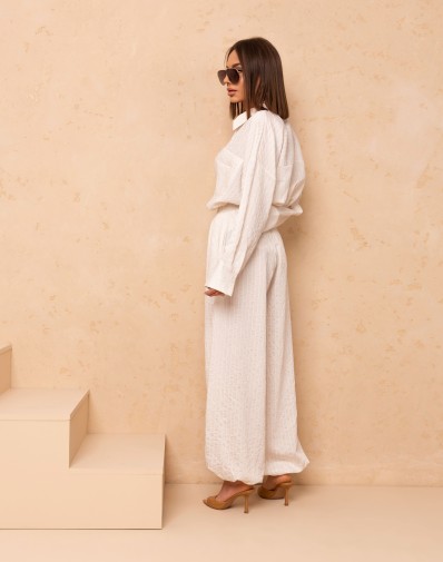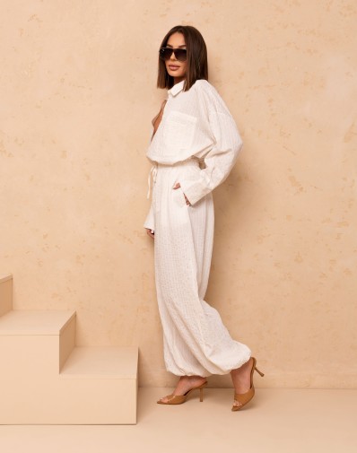 Komplet wykonany z delikatnej,zwiewnej wiskozy.Klasyczna koszula z długim rękawem zakończonym szerszym mankietem,zapinana po długości na guziki ,klasyczny kołnierz.Na przodzie jedna kieszonka.Spodnie na grubszej gumie-dodatkowo ze sznurkiem ozdobnym,szeroka nogawka zakończona gumą co daje nam krój alladynek.Kieszenie z boku.Komplet tworzy elegancką a zarazem komfortową stylizację na wiele okazji.