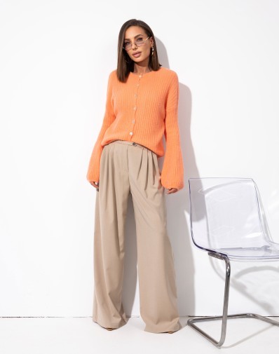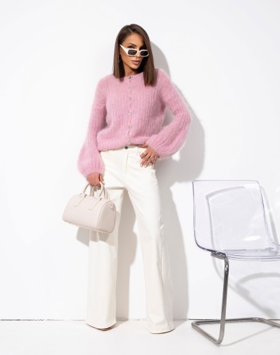 Sweter zapinany na guziki na całej długości, wykonany z miękkiej dzianiny o delikatnej, prążkowanej strukturze. Model z długim rękawem o szerokim, lekko bufiastym kroju, który nadaje całości elegancki i kobiecy charakter. Idealny do codziennych i bardziej stylowych zestawień.