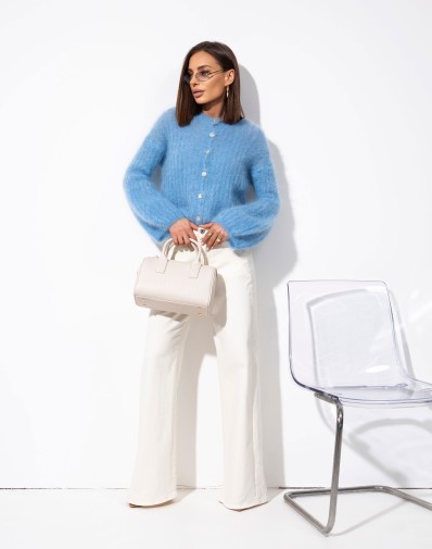 Miękki, niebieski sweter zapinany na guziki, wykonany z puszystej, przyjemnej w dotyku dzianiny. Model z dekoltem w kształcie litery V oraz lekko skróconą długością, która świetnie komponuje się z jeansami i spodniami z wysokim stanem. Delikatnie obniżona linia ramion i rękawy o długości 3/4 nadają mu swobodnego, nowoczesnego charakteru. Idealny wybór na codzienne stylizacje z nutą koloru.