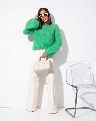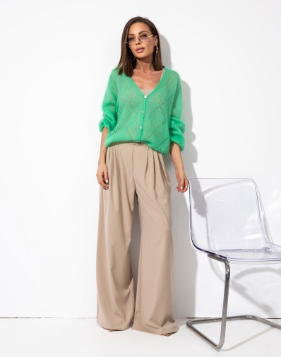 Miękki, zielony sweter zapinany na guziki, wykonany z puszystej, przyjemnej w dotyku dzianiny. Model z dekoltem w kształcie litery V oraz lekko skróconą długością, która świetnie komponuje się z jeansami i spodniami z wysokim stanem. Delikatnie obniżona linia ramion i rękawy o długości 3/4 nadają mu swobodnego, nowoczesnego charakteru. Idealny wybór na codzienne stylizacje z nutą koloru.