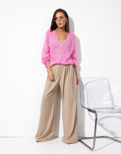 Sweter zapinany na guziki, wykonany z lekkiej i miękkiej dzianiny o dekoracyjnym, ażurowo-prążkowanym splocie. Model z dekoltem w kształcie litery V oraz długim rękawem o luźnym kroju. Delikatna struktura materiału nadaje całości lekkości i kobiecego charakteru.