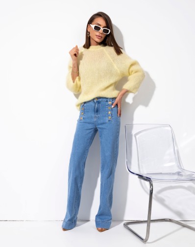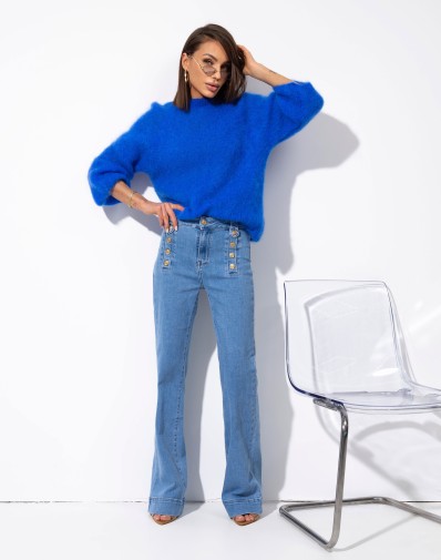 Stylowe i wygodne spodnie jeansowe z szerokimi nogawkami z wysokim stanem.Szerokie nogawki oraz ozdobne,złote guziki przy pasie nadają im nowoczesny,elegancki charakter .Wykonane z miękkiego denimu w klasycznym niebieskim odcieniu jeansu.Idealne zarówno do casualowych jak i bardziej szykownych stylizacji.