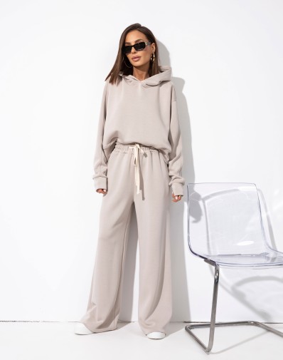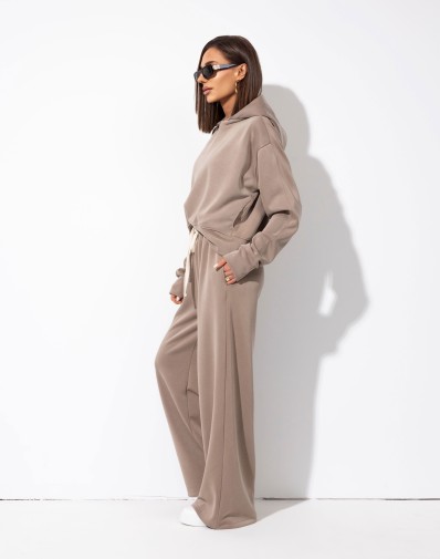 Spodnie z szeroką nogawką, elastyczną gumką i regulacją na sznurek w pasie oraz bocznymi kieszeniami zapewniają wygodę i swobodę noszenia. Krótsza bluza z kapturem i kieszeniami po bokach, całość tworzy nowoczesny charakter. Materiał bardzo przyjemny i delikatny, komfortowy w noszeniu