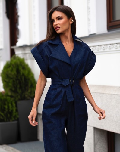 Elegancki kombinezon w kolorze granatowym, który łączy nowoczesny krój z klasyczną elegancją. Posiada szeroki kołnierz, dekolt w kształcie litery V oraz pasek podkreślający talię. Zwężane nogawki zakończone mankietem pięknie komponują się z botkami czy szpilkami. Idealny wybór zarówno na co dzień, jak i na wyjątkowe okazje.