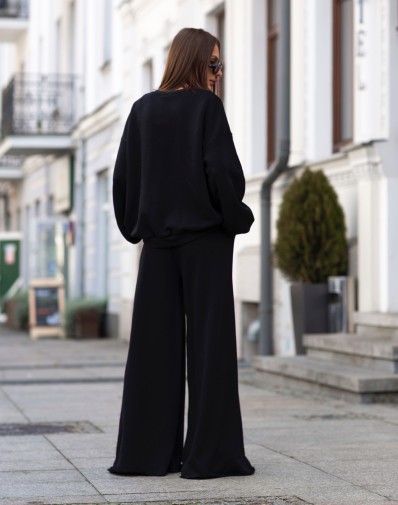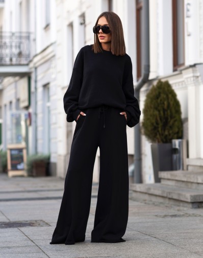Postaw na wygodę i styl w jednym! Czarny komplet dresowy wykonany z miękkiej, przyjemnej w dotyku bawełny to idealny wybór na co dzień. Luźna bluza z opuszczoną linią ramion nadaje swobodnego charakteru, a spodnie z wysokim stanem , regulowanym sznurkiem oraz mocno szerokimi nogawkami gwarantują komfort noszenia przez cały dzień.Uniwersalny kolor sprawia, że zestaw świetnie sprawdzi się zarówno na spacer, spotkanie ze znajomymi, jak i w podróży.