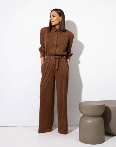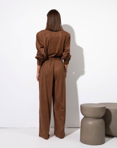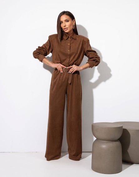 Stylowy komplet wykonany z miękkiego, przyjemnego w dotyku zamszu. Koszula o lekko oversize’owym kroju z poduszkami w ramionach nadaje sylwetce nowoczesny, elegancki kształt. Spodnie z szerokimi nogawkami i elastyczną gumką z tyłu w pasie zapewniają idealne dopasowanie i komfort noszenia. Całość tworzy wyjątkowo modny, a jednocześnie wygodny zestaw — idealny zarówno na co dzień, jak i na specjalne okazje.