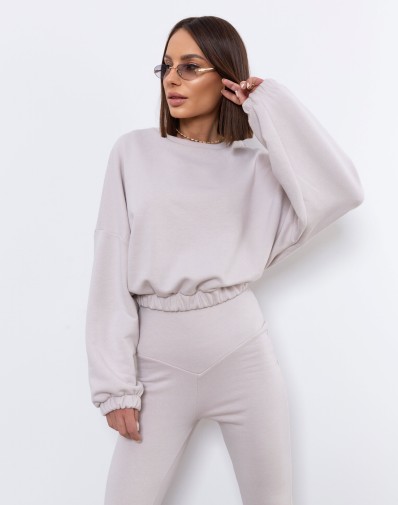 Stylowy i ultrakobiecy komplet, który łączy wygodę z modnym krojem. Bluza o luźnym fasonie z obniżoną linią ramion oraz gumą w pasie idealnie komponuje się z dopasowanymi spodniami z szerokimi nogawkami typu flare. Elastyczny pas podkreśla talię, a miękka, przyjemna w dotyku dzianina zapewnia komfort przez cały dzień. Jasny odcień dodaje lekkości i świetnie sprawdzi się zarówno w casualowych, jak i bardziej stylowych stylizacjach