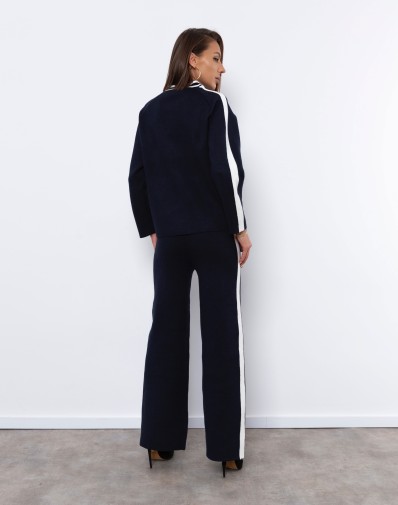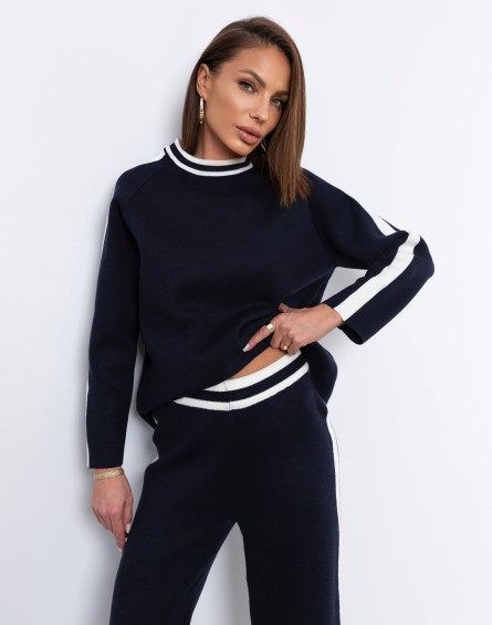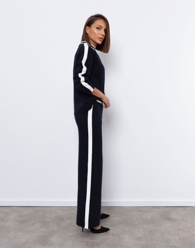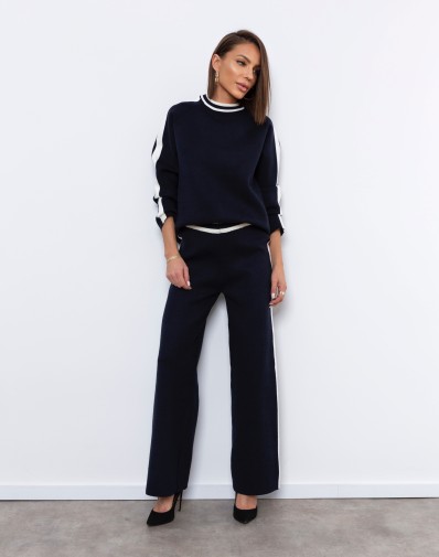 Ten komplet to idealne połączenie wygody i stylu. Uszyty z mięsistego, miękkiego materiału, który otula i daje wyjątkowy komfort noszenia. Spodnie mają luźny krój i wygodną gumę w pasie, dzięki czemu doskonale dopasowują się do sylwetki. Po bokach zdobią je eleganckie śmietankowe lampasy, które dodają całości charakteru. Idealny zestaw na co dzień, do pracy lub na spotkanie z przyjaciółkami.