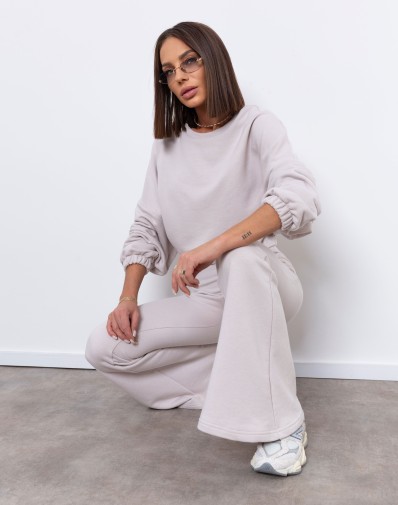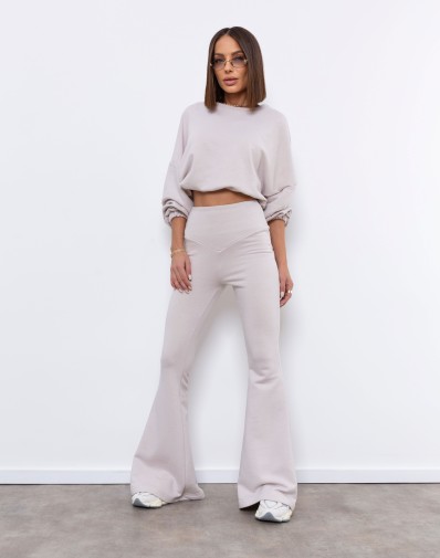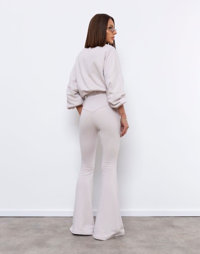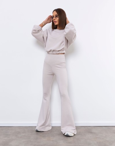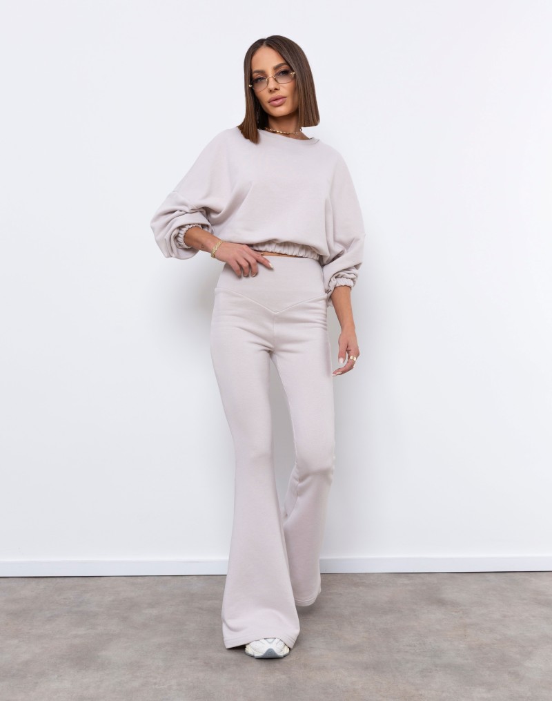 Stylowy i ultrakobiecy komplet, który łączy wygodę z modnym krojem. Bluza o luźnym fasonie z obniżoną linią ramion oraz gumą w pasie idealnie komponuje się z dopasowanymi spodniami z szerokimi nogawkami typu flare. Elastyczny pas podkreśla talię, a miękka, przyjemna w dotyku dzianina zapewnia komfort przez cały dzień. Jasny odcień dodaje lekkości i świetnie sprawdzi się zarówno w casualowych, jak i bardziej stylowych stylizacjach