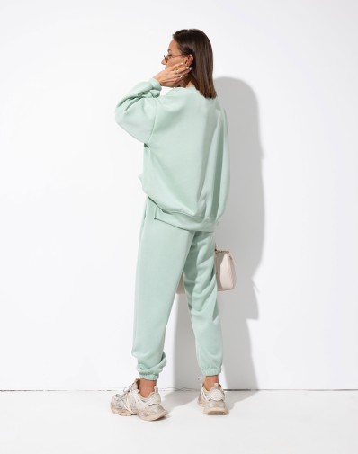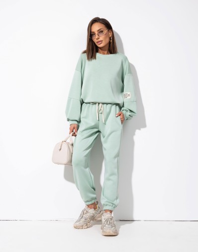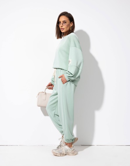 Komplet dresowy w pistacjowym kolorze, wykonany z miękkiego i przyjemnego w dotyku materiału. Spodnie z elastyczną gumką i regulacją na sznurek w pasie, posiadają praktyczne kieszenie po bokach oraz ściągacze na dole nogawek. Luźna bluz z tyłu dłuższa z ozdobną naszywką na rękawie zapewnia komfort i swobodny, casualowy look.