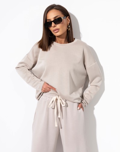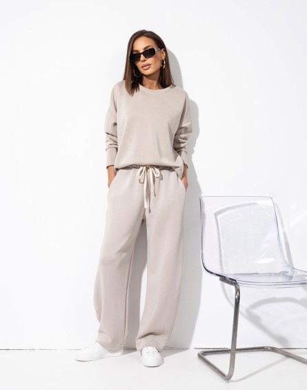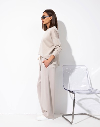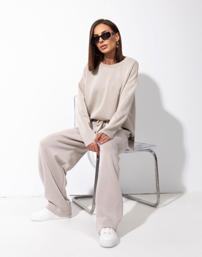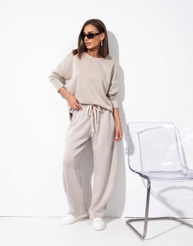 Komplet bluza + spodnie wykonany z bardzo przyjemnego w dotyku materiału.Klasyczna,gładka bluza z dłuższym tyłem. Spodnie z delikatnie zwężaną nogawką , elastyczną gumką i regulacją na sznurek w pasie oraz bocznymi kieszeniami zapewniają wygodę i swobodę noszenia.Set idealny na co dzień, wygoda i styl w jednym.