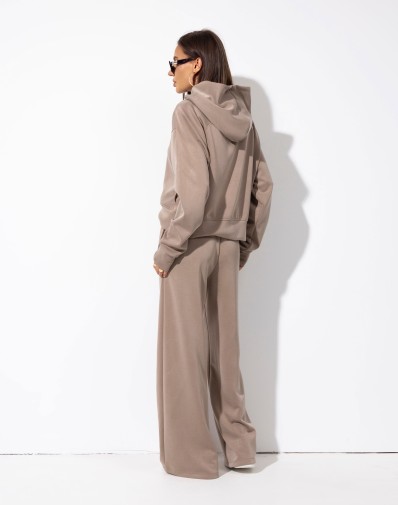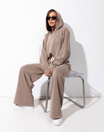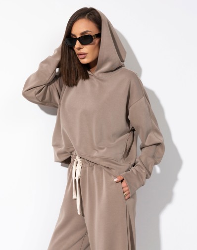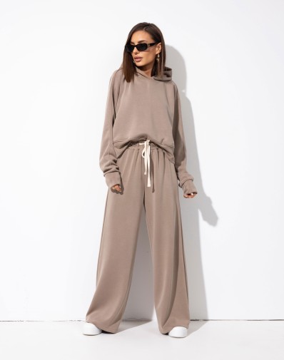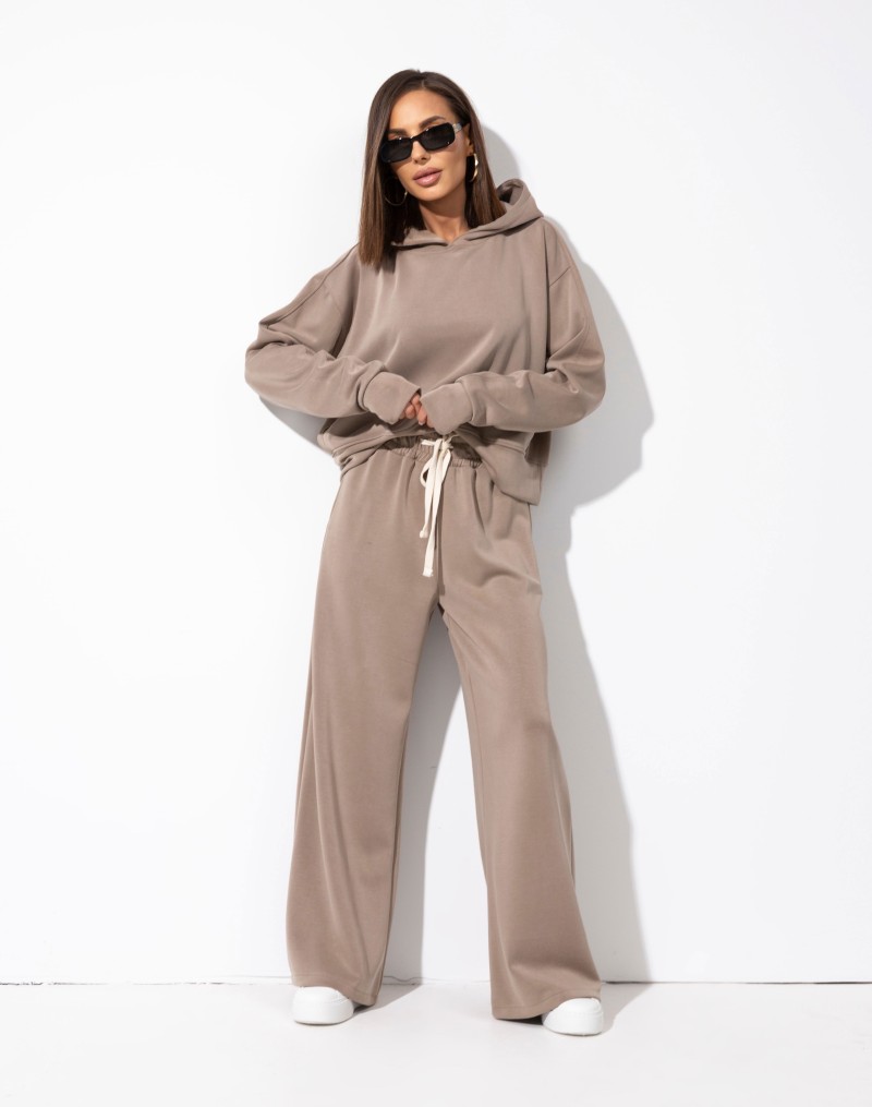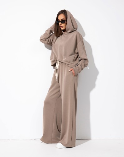 Spodnie z szeroką nogawką, elastyczną gumką i regulacją na sznurek w pasie oraz bocznymi kieszeniami zapewniają wygodę i swobodę noszenia. Krótsza bluza z kapturem i kieszeniami po bokach, całość tworzy nowoczesny charakter. Materiał bardzo przyjemny i delikatny, komfortowy w noszeniu