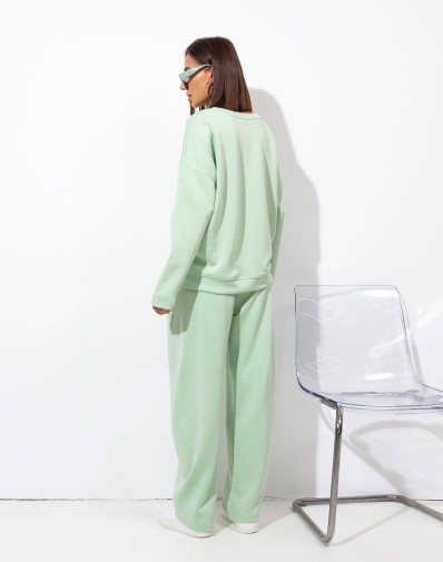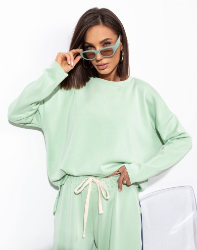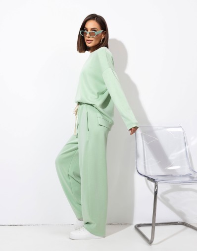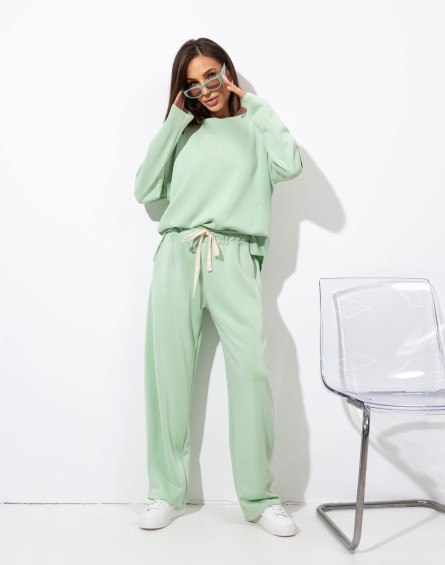 Komplet bluza + spodnie wykonany z bardzo przyjemnego w dotyku materiału.Klasyczna,gładka bluza z dłuższym tyłem. Spodnie z delikatnie zwężaną nogawką , elastyczną gumką i regulacją na sznurek w pasie oraz bocznymi kieszeniami zapewniają wygodę i swobodę noszenia.Set idealny na co dzień, wygoda i styl w jednym.