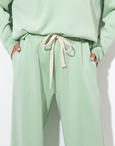 Spodnie o prostym kroju z elastyczną gumką w pasie idealnie dopasowują się do sylwetki, zapewniając komfort przez cały dzień. Szeroka nogawka i subtelnie odznaczony lampas dodają całości charakteru, a praktyczne kieszonki po bokach podkreślają casualowy styl.