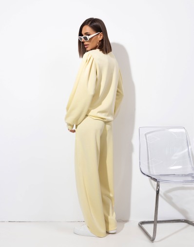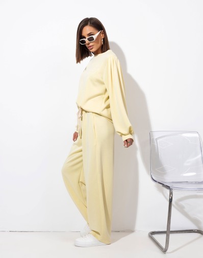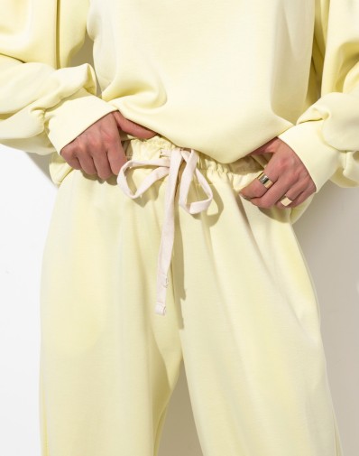 Komplet bluza + spodnie z miękkiego, masełkowego materiału w cytrynowym kolorze. Oversize’owa bluza z efektownymi, bufistymi rękawami nadaje stylizacji lekkości i modowego charakteru. Spodnie o luźnym kroju typu balloon, z gumą i regulowanym sznurkiem w pasie, zapewniają maksymalny komfort noszenia. Bocznie umieszczone kieszenie dodają funkcjonalności. Idealny zestaw na co dzień – wygodny, a jednocześnie bardzo stylowy.