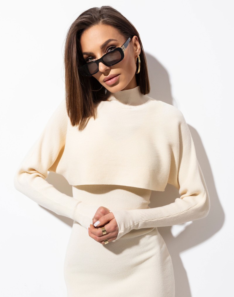 Dzianinowa sukienka 2w1 w kolorze ecru o dopasowanym kroju z krótkim, prążkowanym sweterkiem typu crop. Model z długim rękawem i półgolfem, który tworzy modny efekt warstwowy. Miękka, elastyczna dzianina zapewnia komfort noszenia i ładnie dopasowuje się do sylwetki. Idealna na stylowe, codzienne i eleganckie stylizacje.Elastyczny materiał