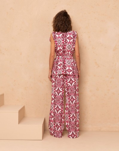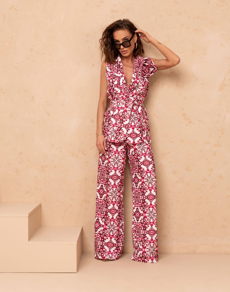 Stylowy komplet w biało-czerwony wzór, który przyciąga uwagę elegancją i nowoczesnym krojem. Dłuższa kamizelka zapinana na guziki, z paskiem podkreślającym talię oraz dopinanym kwiatem, dodaje całości wyjątkowego charakteru. Spodnie z wygodną gumką z tyłu oraz zapięciem na zamek i guzik zapewniają komfort noszenia i idealne dopasowanie. To doskonały wybór zarówno na wyjątkowe okazje, jak i stylowe wyjścia na co dzień.