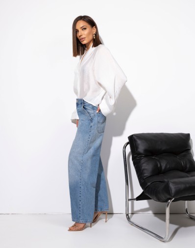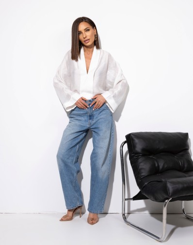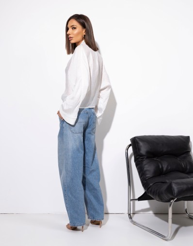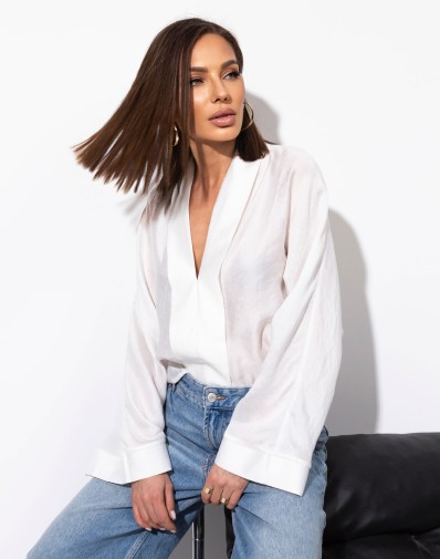 Biała koszula oversize z szalowym kołnierzem, idealna na każdą okazję. Jej dekolt w serek dodaje elegancji, a delikatnie prześwitujący materiał sprawia, że koszula jest lekka i przewiewna. Perfekcyjnie komponuje się z jeansami, spódnicami czy szortami, zapewniając stylowy, swobodny look. Doskonała propozycja na wiosenne i letnie dni.