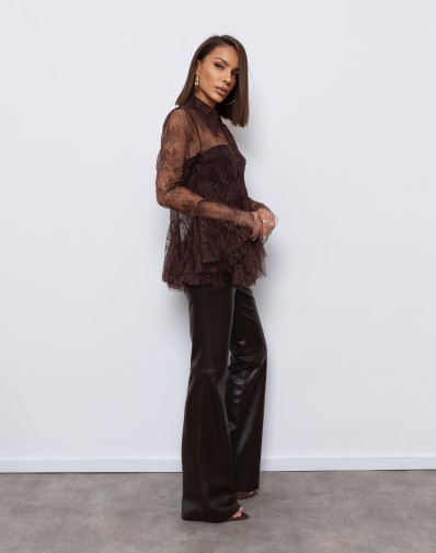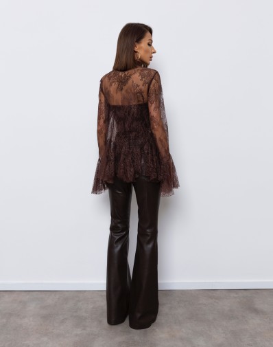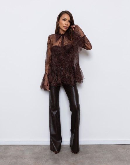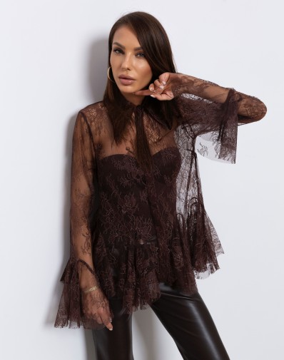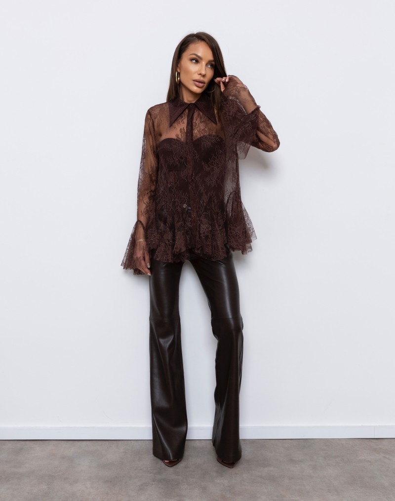 Zmysłowa, elegancka koszula wykonana z delikatnej koronki o kwiatowym wzorze. Transparentny materiał subtelnie odsłania ciało, tworząc wyjątkowo kobiecy efekt. Model z lekkim rozkloszowaniem i ozdobnymi falbanami na rękawach dodaje romantycznego charakteru. Idealna na wieczorne wyjścia, randkę lub wyjątkową okazję – doskonale komponuje się ze skórzanymi spodniami lub dopasowaną spódnicą. (Do stylizacji zostały użyte body)