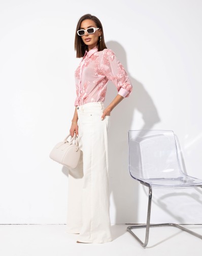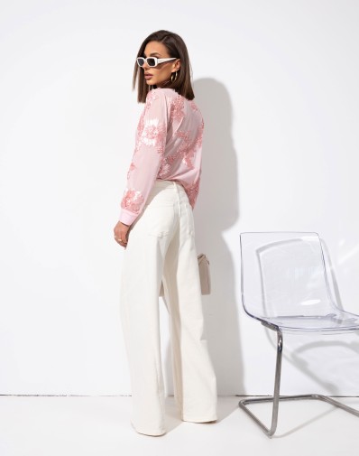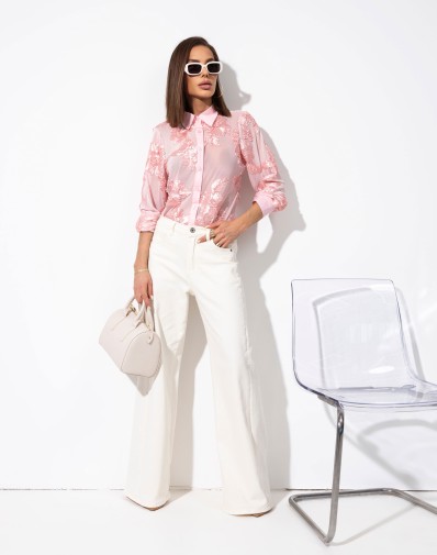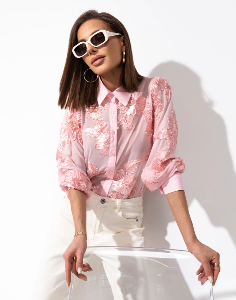 Elegancka koszula transparentna. Wykonana z lekkiego,elastycznego materiału. Model o prostym,klasycznym kroju z kołnierzykiem i zapięciem na guziki.Rękawy zakończone mankietami. Przezroczysta struktura nadaje koszuli kobiecego charakteru i wyjątkowego wyglądu , naszyte kwiaty dodają delikatności.. Idealna na wieczorne wyjścia, spotkania czy eleganckie stylizacje z nutą nowoczesności.