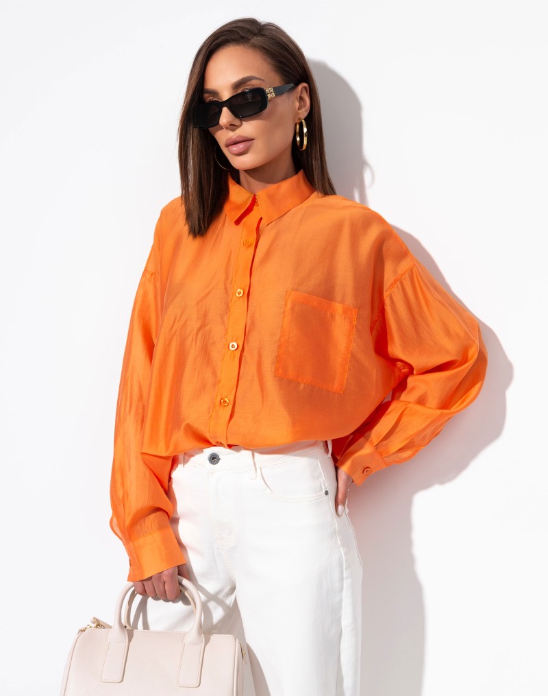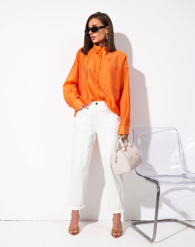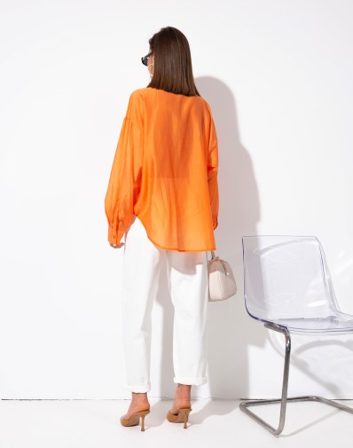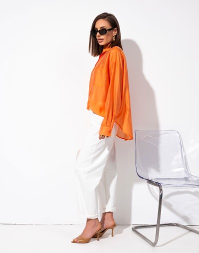 Klasyczna wiskozowa koszula o luźnym kroju, zapinana na guziki, z eleganckim kołnierzykiem i jedną kieszonką z przodu. Wykonana z delikatnego, lekko zwiewnego materiału, który pięknie układa się na sylwetce. Zaokrąglony dół dodaje lekkości, a subtelny pomarańczowy kolor podkreśla kobiecy charakter modelu.