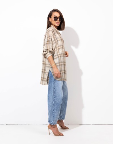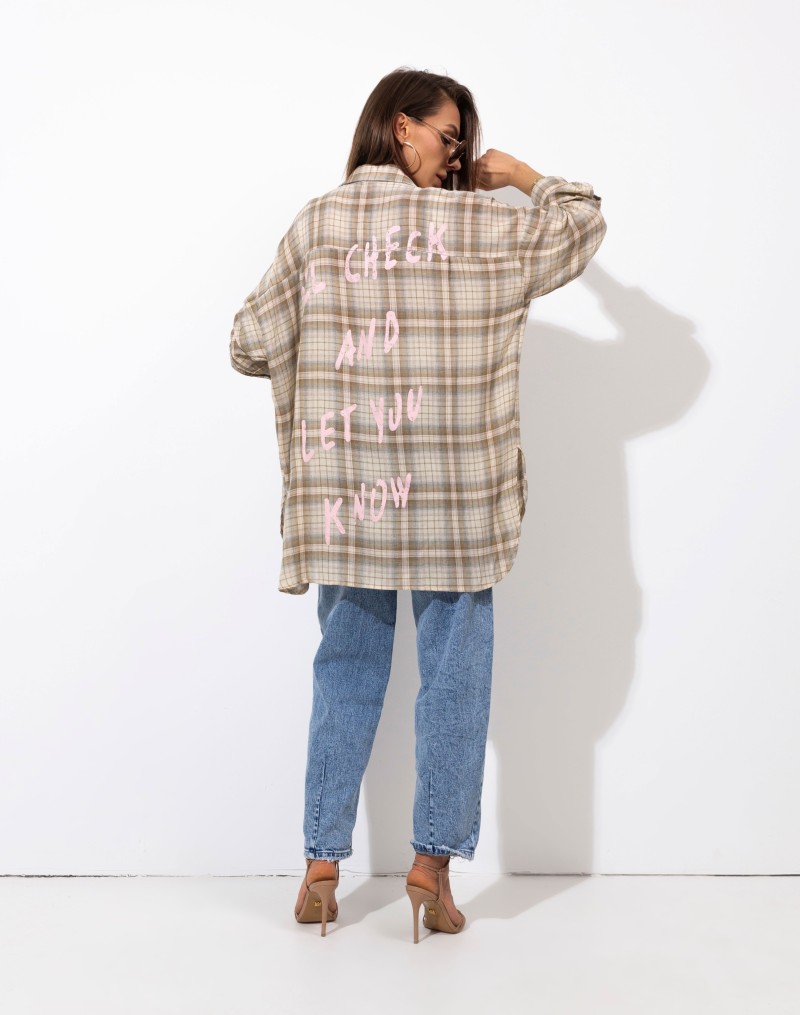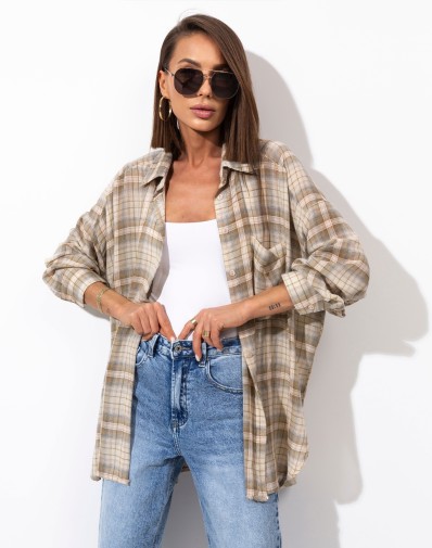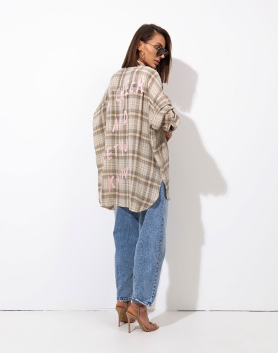 Stylowa koszula o oversize’owym kroju w modny, beżowy wzór w kratę. Wykonana z miękkiego, przyjemnego w dotyku materiału, który zapewnia wygodę przez cały dzień. Model zapinany na guziki z klasycznym kołnierzykiem i mankietami przy rękawach. Tył delikatnie dłuższy z nadrukiem na plechach .Doskonale sprawdzi się w casualowych stylizacjach – noś ją z jeansami, topem lub jako lekką narzutkę. Idealna propozycja dla miłośniczek miejskiego luzu i modnego stylu vintage.