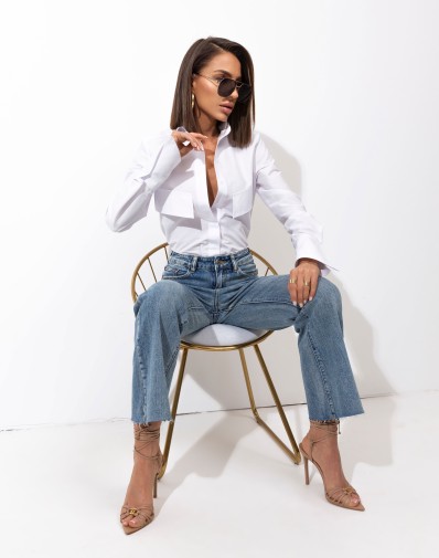 Klasyczna biała koszula damska zapinana na kryte guziki to ponadczasowa baza do wielu stylizacji. Model z klasycznym kołnierzem, długim rękawem zakończonym mankietami oraz ozdobnymi patkami z przodu, które nadają całości subtelnego charakteru. Idealna zarówno do eleganckich, jak i codziennych zestawów.