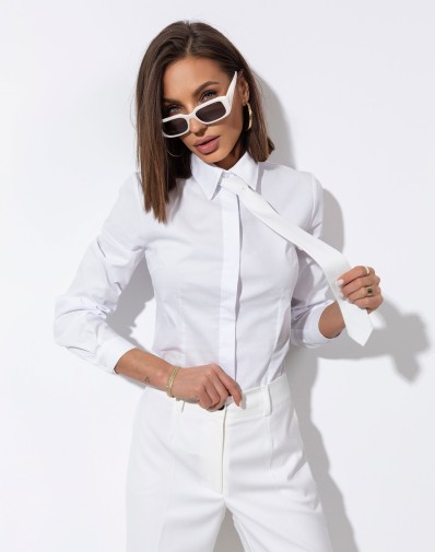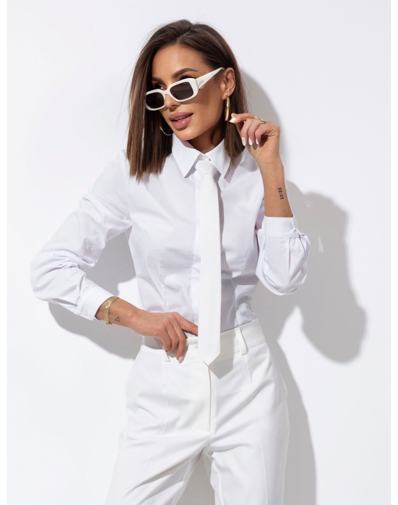 Klasyczna biała koszula damska zapinana na kryte guziki to ponadczasowa baza do wielu stylizacji. Model z klasycznym kołnierzem, długim rękawem zakończony niewielkimi mankietami Z przodu i z tyłu zrobione zakładki przez co koszula idealnie dopasowuje się w talii. Idealna zarówno do eleganckich, jak i codziennych zestawów.KRAWAT NIE JEST W ZESTAWIE .