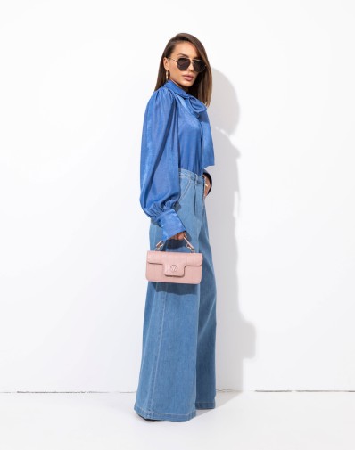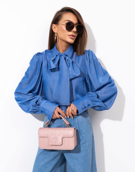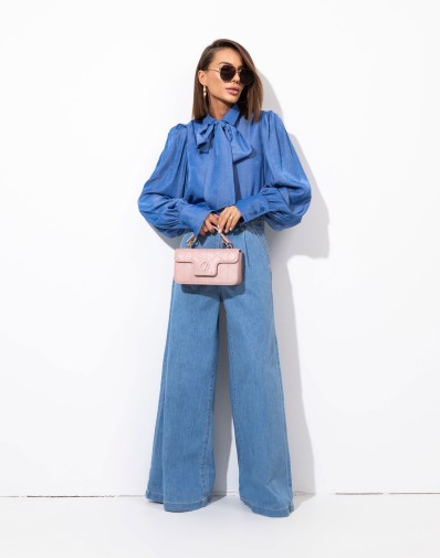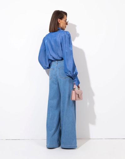 Koszula z kołnierzykiem wykonana z tkaniny jeansowej . Zapinana na guziki. Obniżona linia ramion i wydłużone, efektowne mankiety. W komplecie szarfa do wiązania pod szyją. Tkanina wiskozowa z satynowym połyskiem. Koszula pasuje do wielu typów sylwetki. Możesz ją nosić luźno opuszczoną, zawiązaną na węzeł lub wsuniętą do spodni.