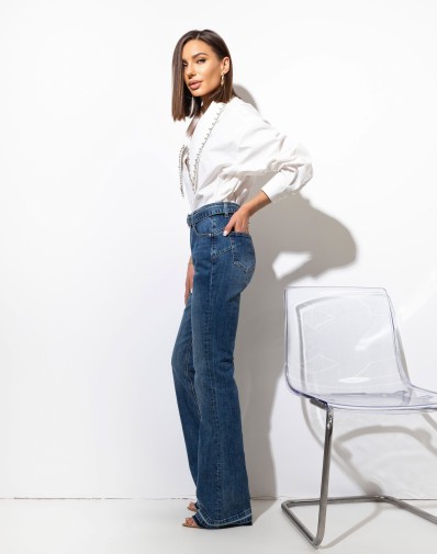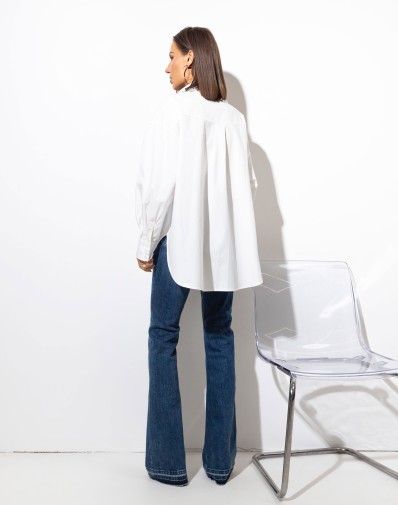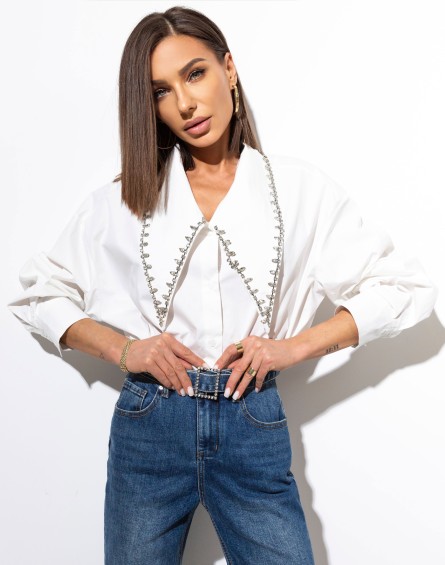 Bawełniana długa koszula z długim,szpiczastym kołnierzem ozdobionym srebrnymi cyrkoniami i guzikami na całej długości. Luźny fason z dłuższym tyłem. Długi rękaw zakończony szerokim mankietem oraz obniżona linia ramion. Must have w każdej kobiecej szafie.
