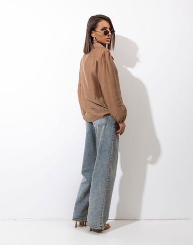 Elegancka bluzka damska w odcieniu złamanej oliwki, wykonana z lekkiej, lekko połyskującej tkaniny o subtelnej fakturze. Model z klasycznym kołnierzykiem i delikatnym rozcięciem przy dekolcie, zapinany na dyskretne zapięcie. Długie rękawy zakończone elastycznymi mankietami zapewniają wygodę noszenia i dopasowanie. Idealna do stylizacji biurowych oraz na eleganckie wyjścia.
