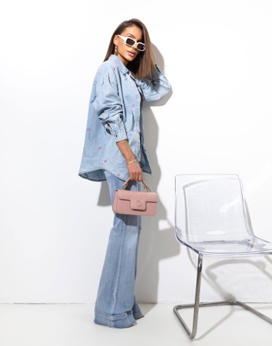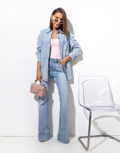Stylowa koszula z jeansowej tkaniny o klasycznym kroju z motywem różowych kokardek . Wykonana z miękkiego, przyjemnego w dotyku materiału, który zapewnia wygodę przez cały dzień. Model zapinany na guziki z klasycznym kołnierzykiem i mankietami przy rękawach.Tył delikatnie dłuższy.Doskonale sprawdzi się w casualowych stylizacjach – noś ją z jeansami, topem lub jako lekką narzutkę.