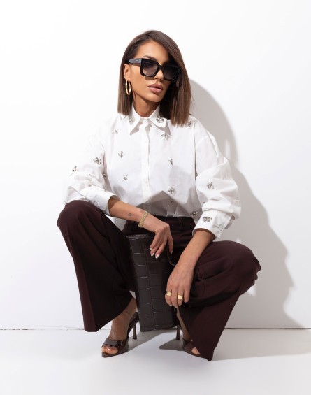 Elegancka biała koszula o luźnym, nowoczesnym kroju, która łączy klasykę z subtelnym blaskiem. Model wyróżniają ozdobne aplikacje z kryształkami rozmieszczone na całej powierzchni, dodające stylizacji wyjątkowego charakteru. Wykonana z przyjemnej, lekkiej tkaniny, zapewnia komfort noszenia przez cały dzień. Idealna zarówno do eleganckich stylizacji z marynarką, jak i do casualowego looku z jeansami.