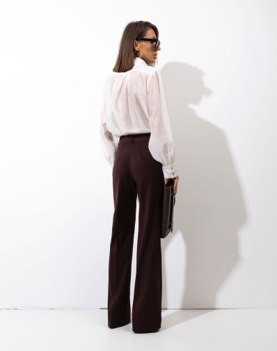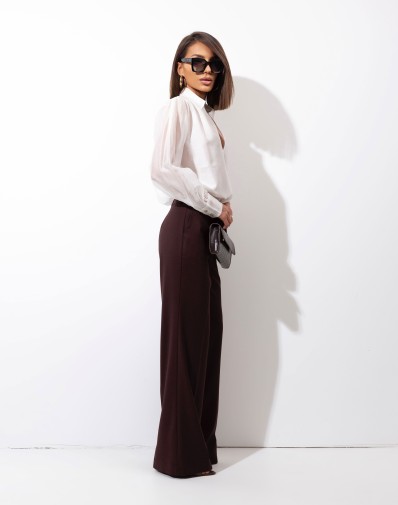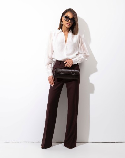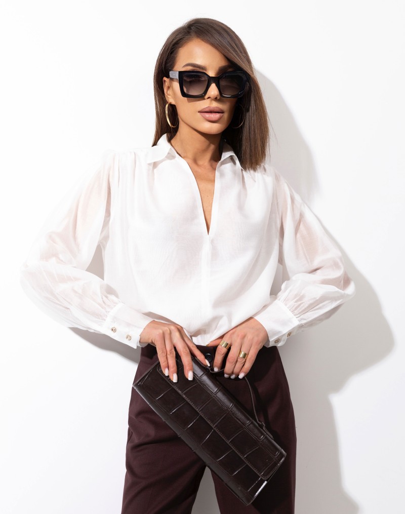 Elegancka bluzka damska w odcieniu delikatnej śmietanki wykonana z lekkiej,miękkiej, bardzo przyjemnej tkaniny .Przód koszuli z podwójnego materiału. Delikatnie bufiaste rękawy.Model z klasycznym kołnierzykiem i delikatnym dekoltem V. . Długie rękawy zakończone elastycznymi mankietami zapinanymi na ozdobne guziki. Idealna do stylizacji biurowych oraz na eleganckie wyjścia.