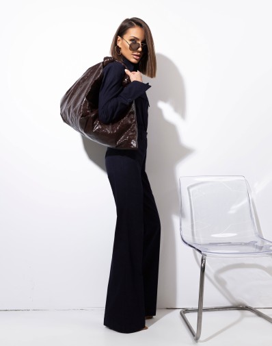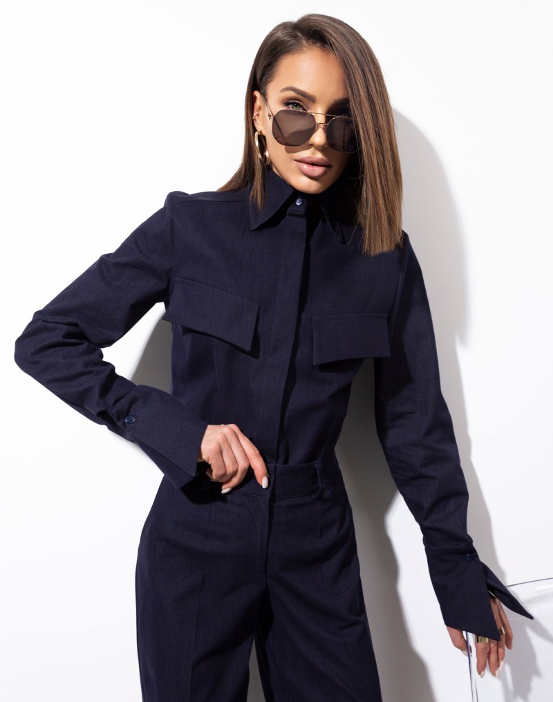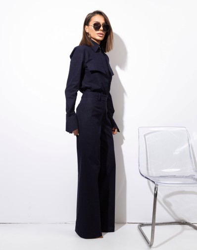 Bawełniany komplet w granatowym dżinsie.Klasyczna  koszula damska zapinana na kryte guziki to ponadczasowa baza do wielu stylizacji. Model z klasycznym kołnierzem, długim rękawem zakończonym dłuższym mankietem oraz ozdobnymi patkami z przodu, które nadają całości subtelnego charakteru.Spodnie z rozszerzaną nogawką. W pasie szlufki. Przód zapinany na klasyczne zapięcie. Z przodu wsuwane kieszenie. Z tyłu patki.