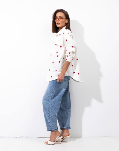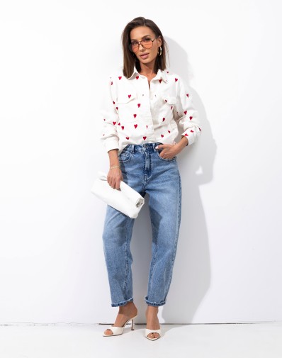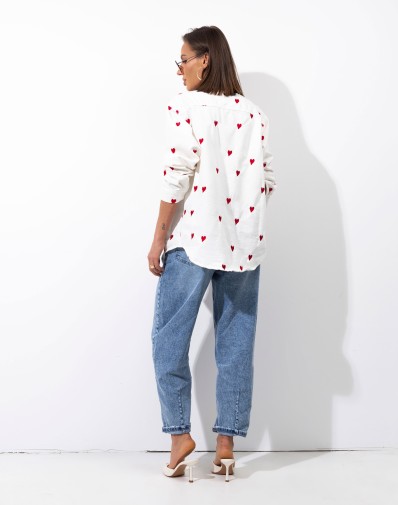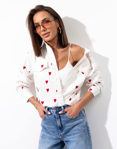 Stylowa bawełniana koszula z jeansowej tkaniny o klasycznym kroju z motywem wyszytych czerwonych serc. Wykonana z miękkiego, przyjemnego w dotyku materiału, który zapewnia wygodę przez cały dzień. Model zapinany na guziki z klasycznym kołnierzykiem i mankietami przy rękawach zapinanych na guziki.Z przodu dwie kieszonki z patkami.Doskonale sprawdzi się w casualowych stylizacjach – noś ją z jeansami, topem lub jako lekką narzutkę.
